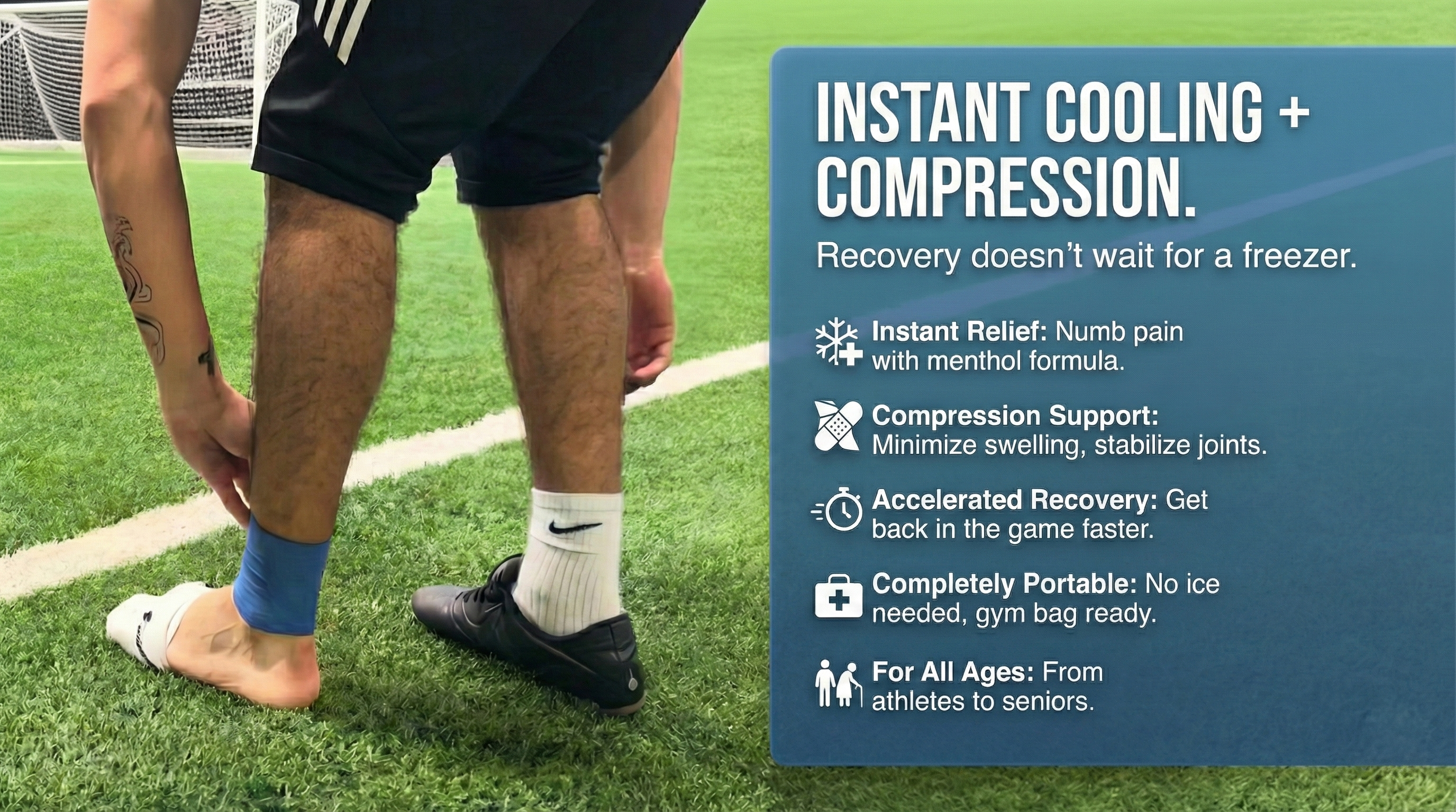It’s commonly used for ankle sprains, knee pain, wrist injuries, muscle soreness, swelling, and post-workout recovery.